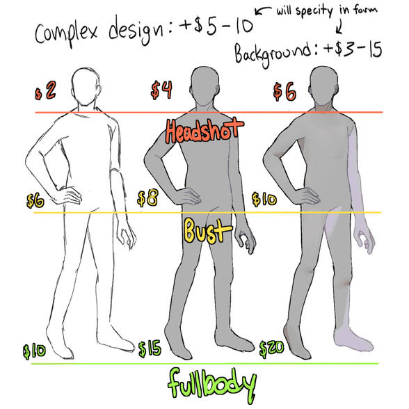 If you have a complex Character design, look at 'complex design' to see the additional prices and what is considered complex.